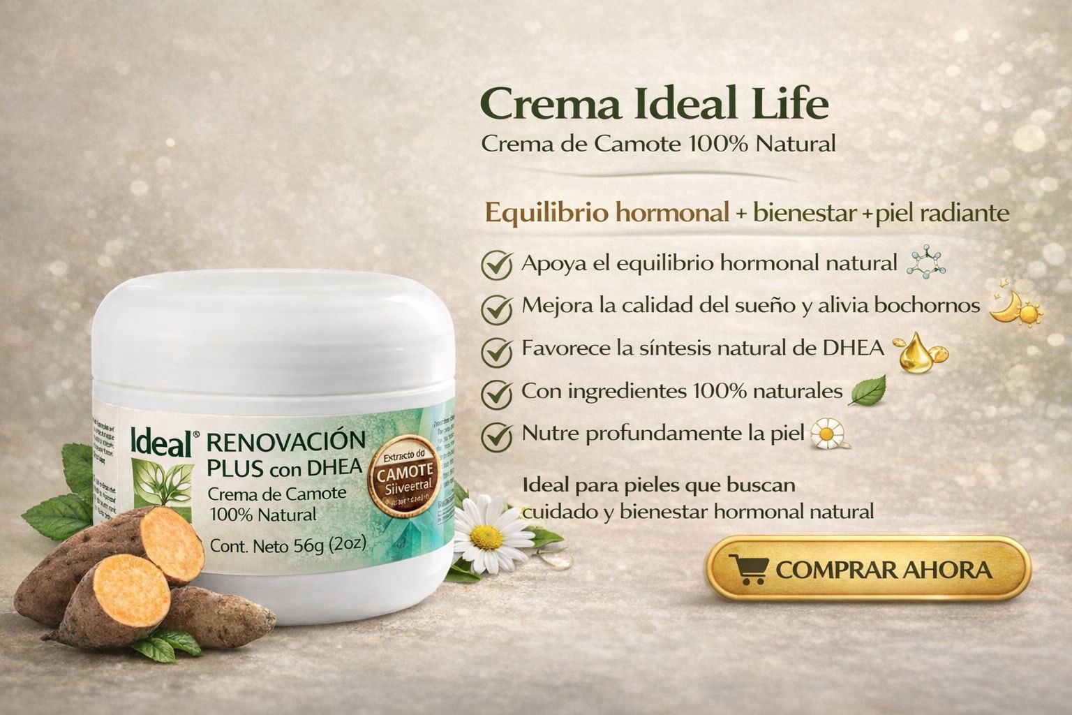 Crema humectante de alta concentración con DHEA (Mimético de la Hormona de la Juventud), ahora con Ginseng, ácidos grasos y Omegas 3, 6, 7 y 9 que mejoran su absorción.