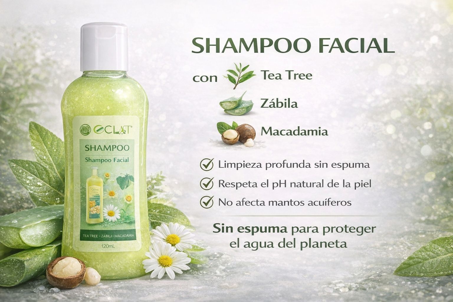 Con ingredientes naturales como Tea Tree (Melaleuca), Macadamia y Zábila, este shampoo facial es ideal para el uso diario, dejando tu piel limpia, fresca e hidratada. ?