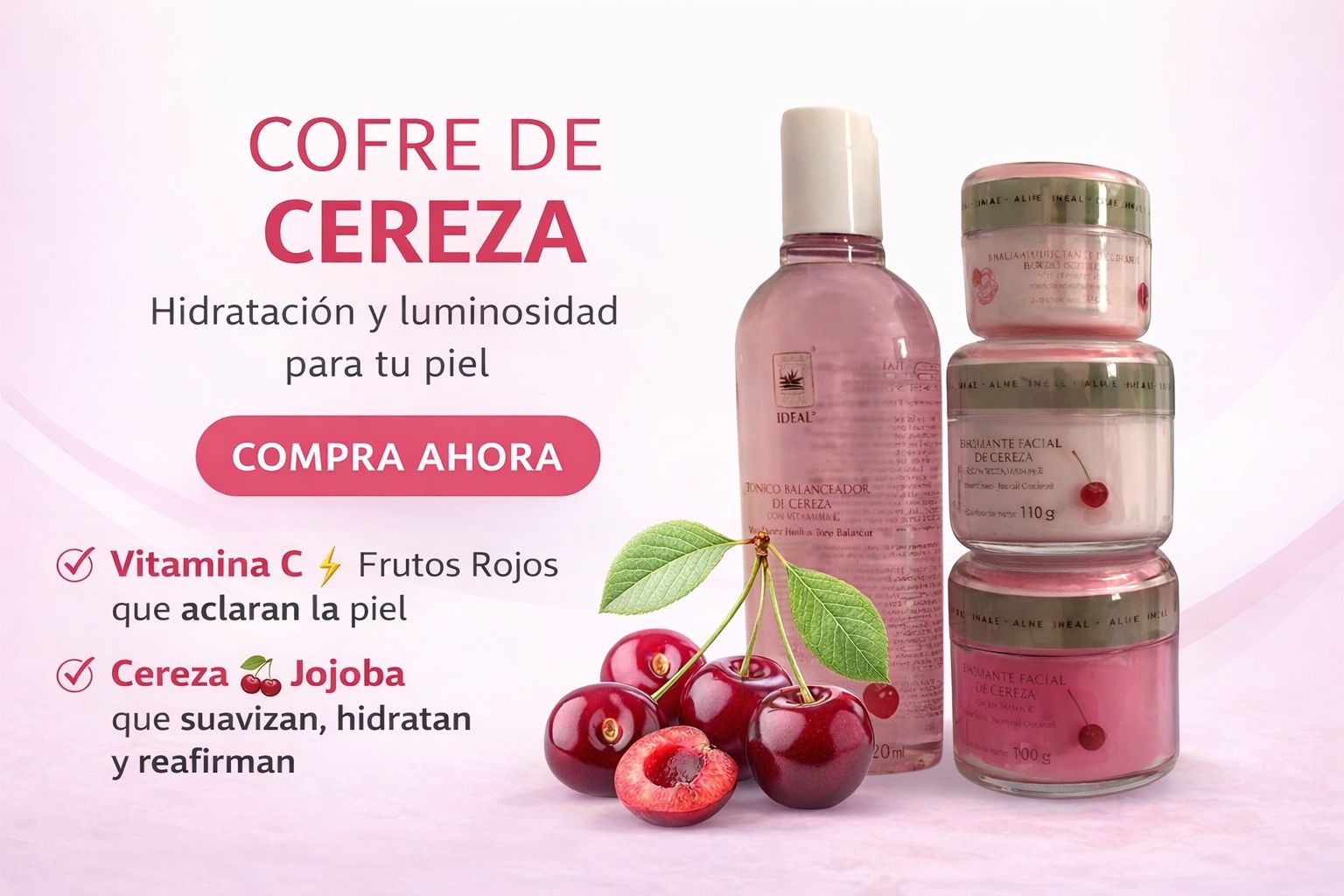 Vitamina C, Cereza, jojoba, colágeno, frutos rojos, para hidratar y renovar la piel.